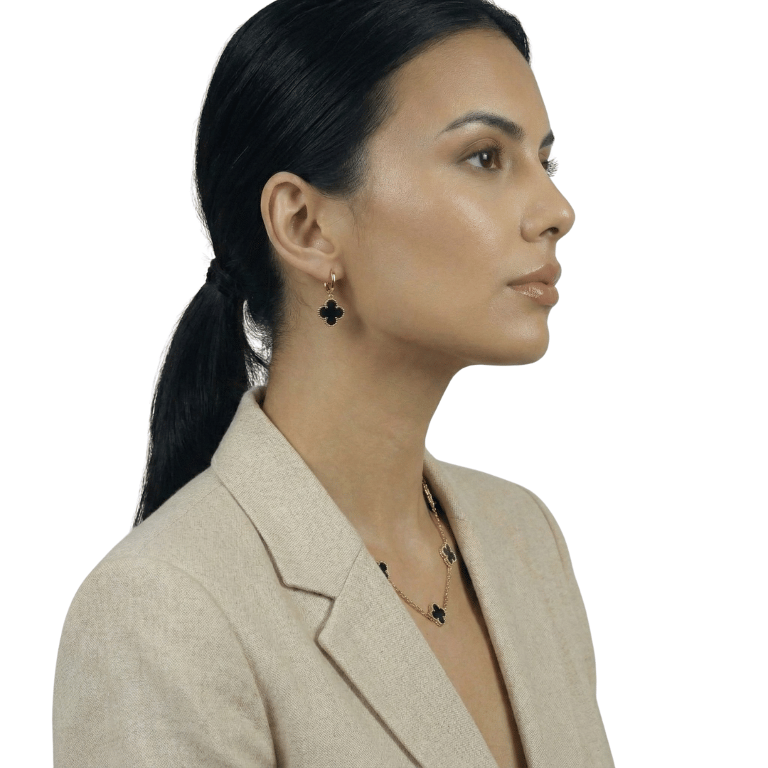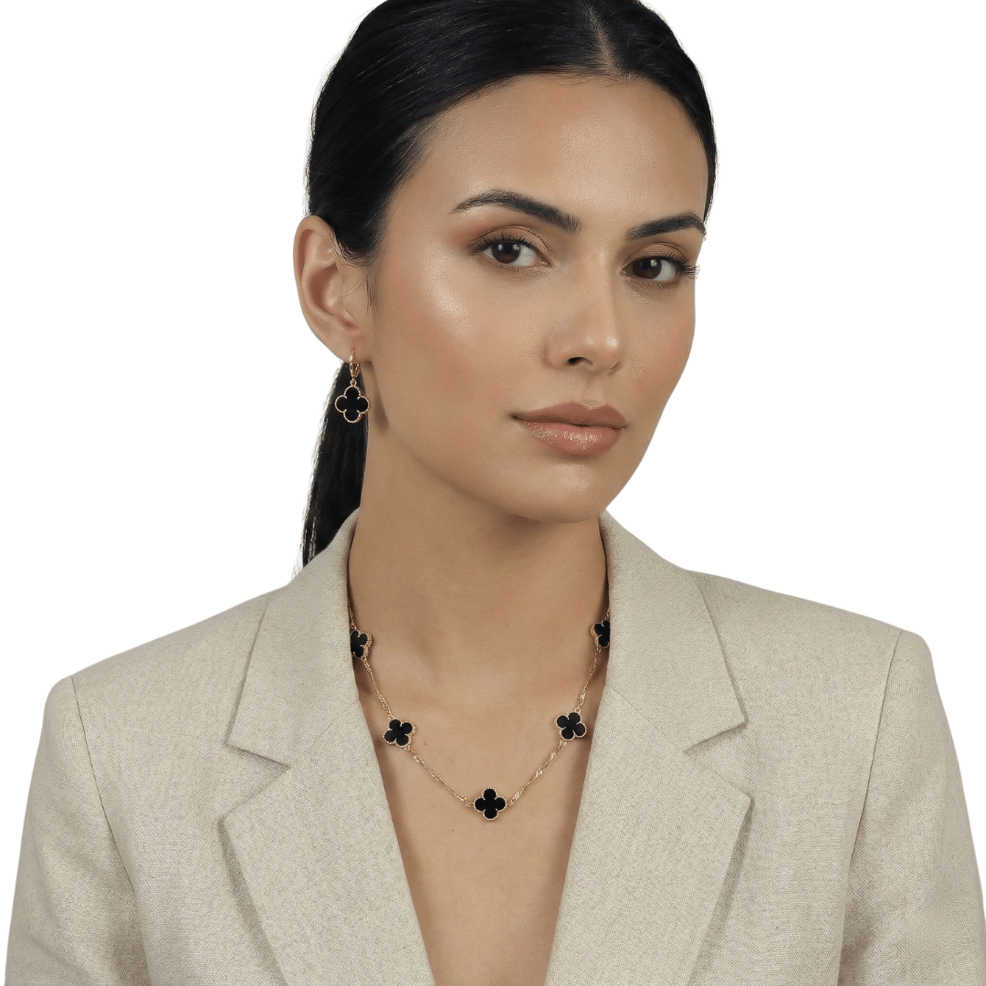 Use como peça central em looks monocromáticos, com decotes delicados ou em sobreposição com correntes finas. Combine com o brinco Trevo Preto para um conjunto harmonioso.