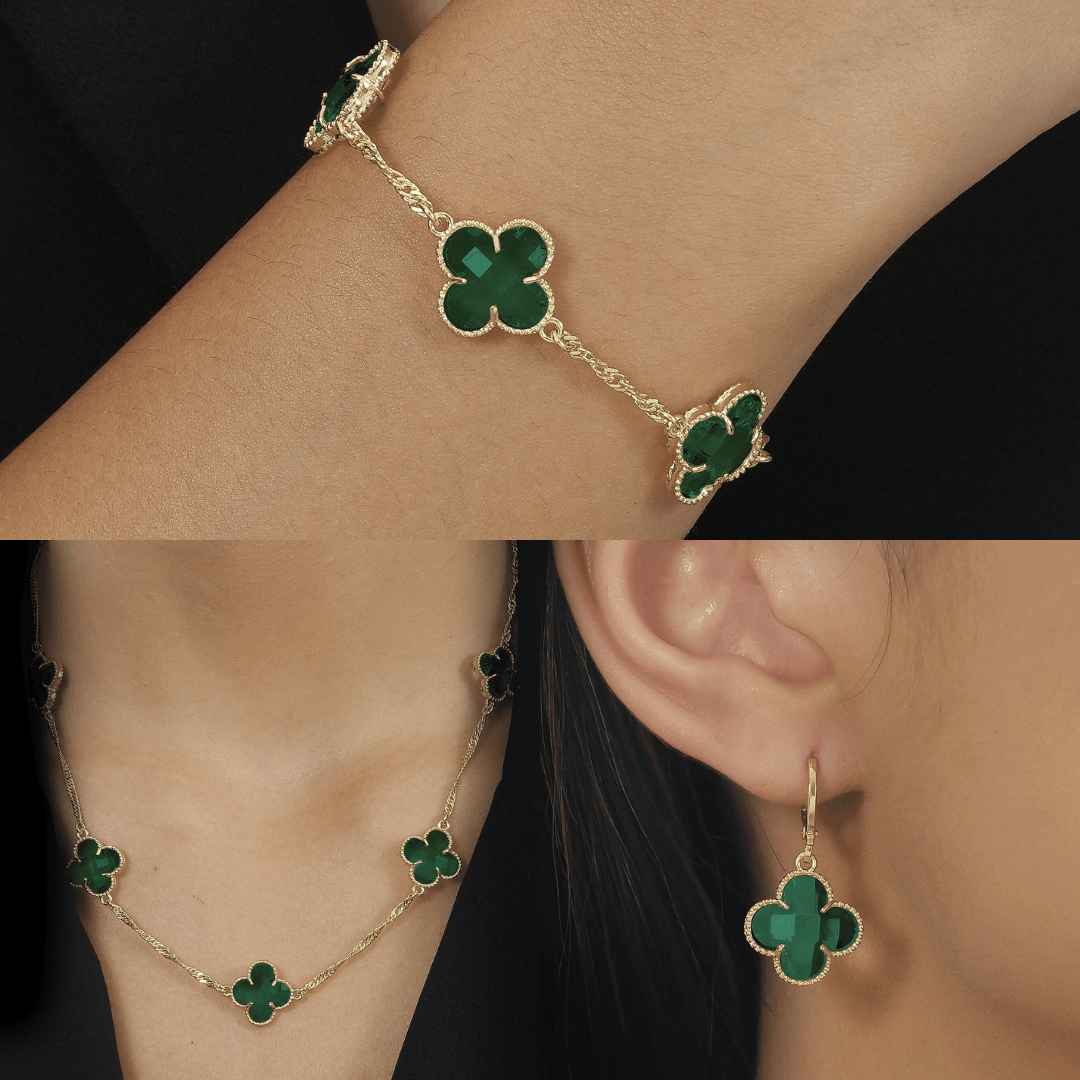 O Conjunto Dourado com Trevos Verdes une três peças elegantes com banho dourado e detalhes de zircônia verde: um colar com cinco pingentes de trevo, uma pulseira coordenada e um par de brincos pequenos no mesmo estilo.